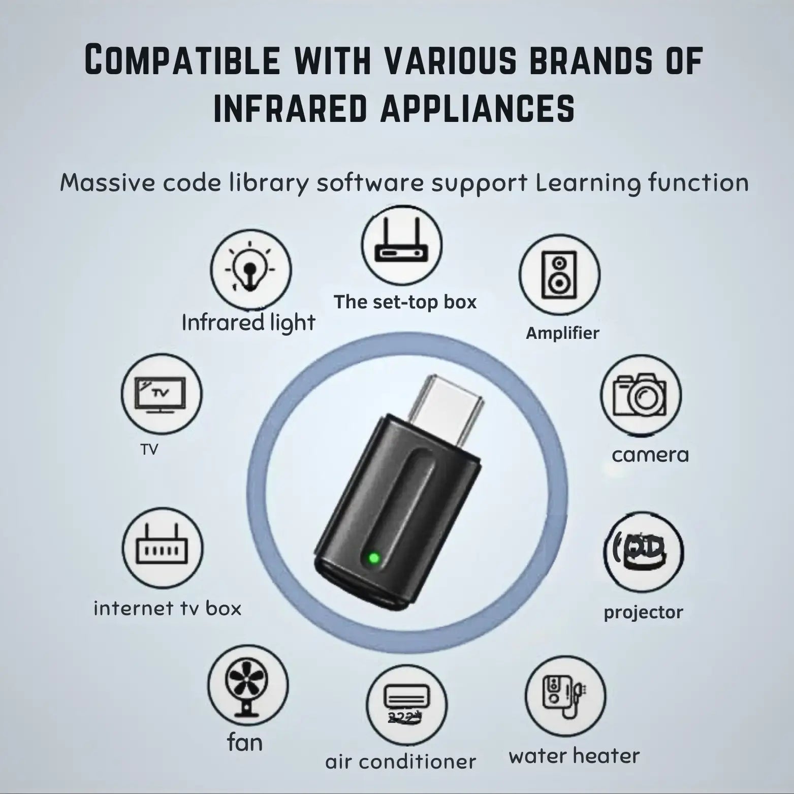 This universal remote control transforms your smartphone into a smart remote control. Easily operate your air conditioner, TV, set-top box, or projector from an 8-15m distance.